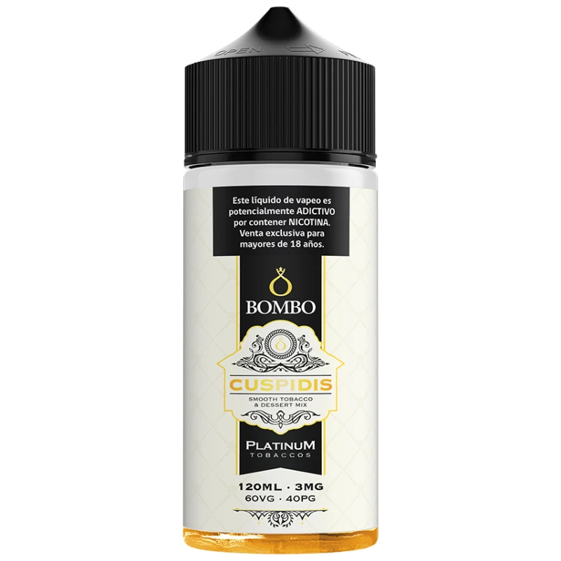 Bombo Cuspidis 120ml, es una creación de la prestigiosa línea Platinum Tobaccos, diseñada para los amantes del tabaco que buscan una experiencia refinada y diferente. Su perfil de sabor combina el carácter elegante del tabaco rubio con la suavidad de los frutos secos y un toque envolvente de chocolate sobre una base de bizcocho esponjoso.