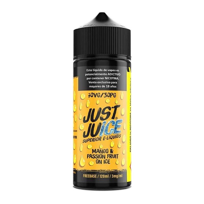 Just Juice Mango Passion Fruit Super Ice 120ml. La mezcla está envuelta en un poderoso efecto ice, que deja una sensación helada y limpia en el paladar al exhalar, haciendo que el sabor sea aún más refrescante y adecuado para días calurosos o para quienes disfrutan de un toque mentolado pronunciado.