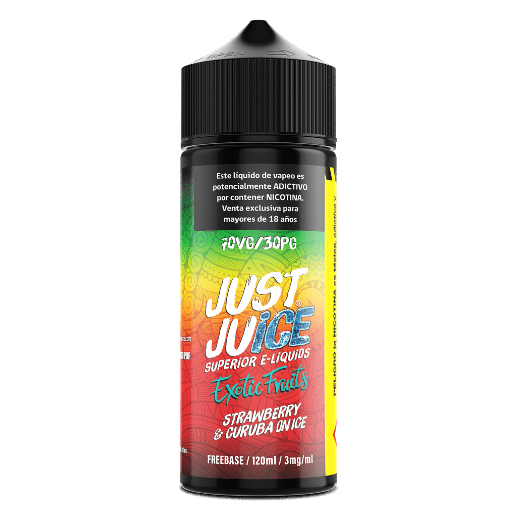 Just Juice Strawberry Curuba Super Ice 120ml, combina a la perfección la dulzura intensa de la frutilla madura y jugosa, evocando el sabor natural de la fruta recién cosechada, con el carácter exótico de la curuba tropical, una fruta sudamericana de perfil ligeramente ácido, floral y refrescante, similar al maracuyá y la guayaba.