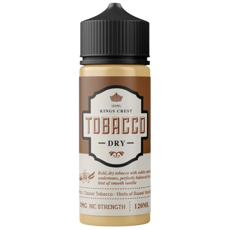 Kings Crest Tobacco Vct Dry 120ml, es una versión refinada y menos dulce de la clásica mezcla de tabaco con vainilla y crema, pensada para quienes prefieren un perfil más seco y auténtico. Esta fórmula ofrece una experiencia de vapeo madura y equilibrada, sin la sobrecarga de dulzura que caracteriza a otros líquidos de la misma línea.